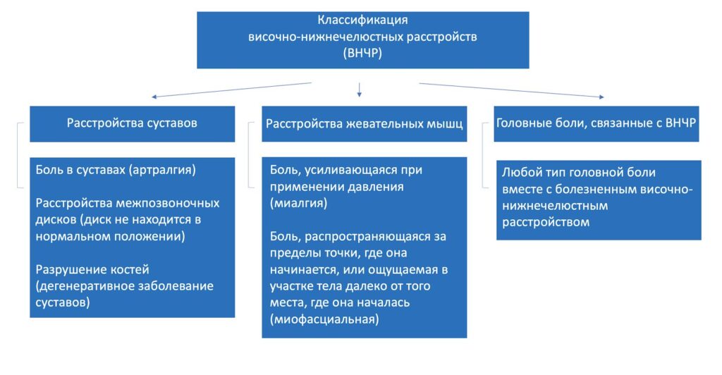Все симптомы при расстройствах в т.ч. воспалении ВНЧС можно разделить на три группы (классификация в рисунке ниже).